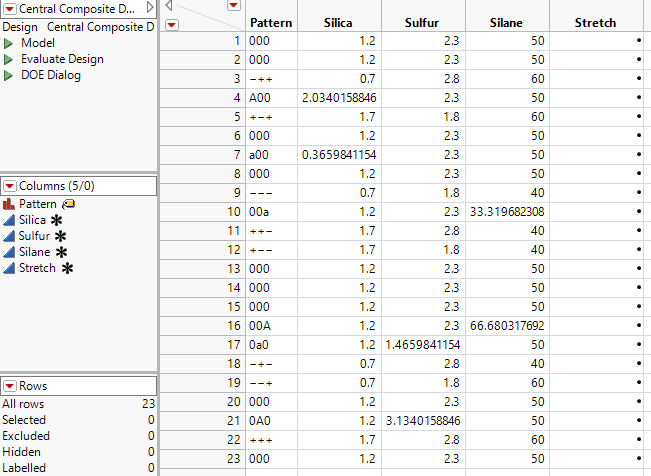 The Design note in the Table panel at the upper left gives the design type that generated the table (Central Composite Design). This information can be helpful if you are comparing multiple designs.
