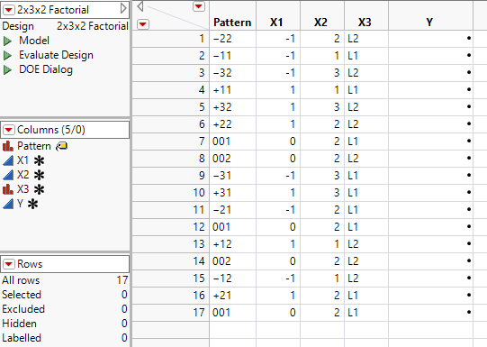 Clicking Make Table creates a data table that contains the runs for your experiment. The example in Figure 11.11 shows a full factorial design with five center points for three factors: X1 (a two-level continuous factor), X2 (a three-level continuous factor), and X3 (a two-level categorical factor). The design uses the default values for the factor levels. The center points are in rows 7, 8, 12, 14, and 17. See Pattern Column.