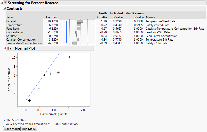 The report shows both Individual and Simultaneous p-values based on Lenth t-ratios. None of the effects are significant, even with respect to the Individual p-values. The Half Normal Plot suggests that the effects reflect only random noise.