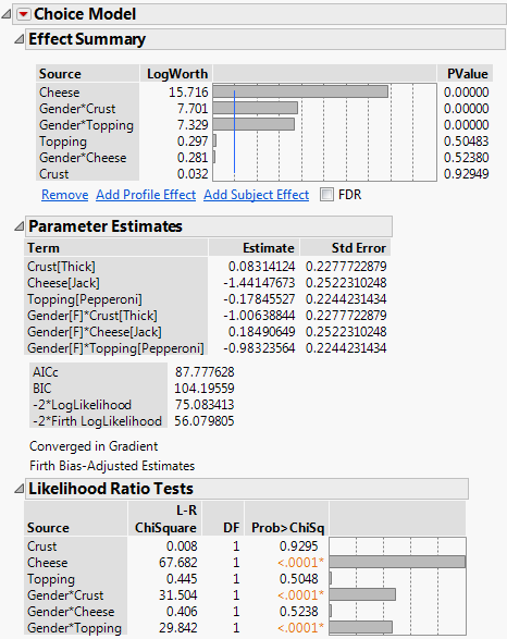 The Effect Summary and Likelihood Ratio Tests reports show strong interactions between Gender and Crust and between Gender and Topping. Notice that the main effects of Crust and Topping are not significant. If you had not included subject-level effects, you might have overlooked important information relative to market segmentation.