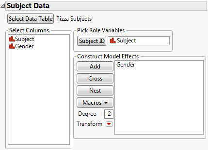 The subjects data table, Pizza Subjects.jmp, includes a Subject ID column and a single characteristic of the subject, Gender. Each value of Subject in the Pizza Subjects.jmp data table corresponds to values in the Subject column in the Pizza Responses.jmp data table.