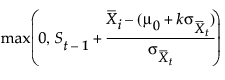 t = 1, 2,..., n, where S0 = 0, zt is defined as for two-sided charts, and the parameter k, termed the reference value, is positive. If the parameter k is not specified in the launch window, k is set to δ/2. The CUSUM St is referred to as an upper cumulative sum. St can be computed as follows: