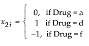 The first indicator variable, x1, is defined as follows. Note that Drug=a contributes a value 1, Drug=d contributes a value 0, and Drug=f contributes a value –1 to the indicator variable: