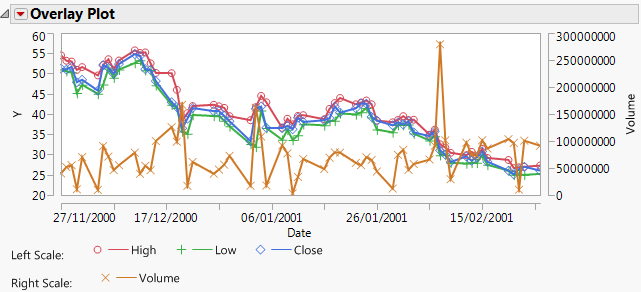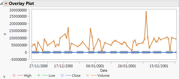 The variables High, Low, and Close are the stock prices of the same stock and thus are on the same scale. Volume is a different scale entirely, representing the trading volume of the entire Dow Jones Industrial Average.