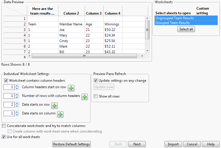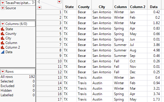 Notice that Replicate data in spanned rows is selected by default. JMP unmerges data that were merged in the worksheet and copies the cell contents as separate categories. “TX” was originally in a merged cell. In JMP, it will be copied into separate cells.