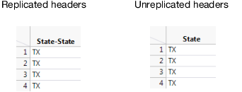 Repeats the header text in each cell for rows that are spanned in the worksheet. For example, the State column heading shown in Figure 2.7 was in a merged cell in the worksheet. On the left, the heading is replicated. Deselect the option to avoid repeating the heading as shown on the right.