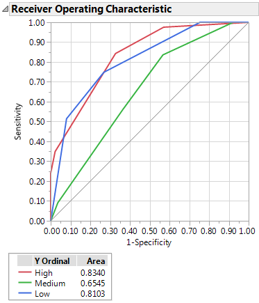 The ROC Curve option is available only for categorical responses. Receiver Operating Characteristic (ROC) curves display the efficiency of a model’s fitted probabilities in sorting the response levels. An introduction to ROC curves is found in ROC Curves in the Basic Analysis book.