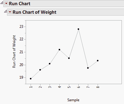 Run charts display a column of data as a connected series of points. The following example is a Run chart for the Weight variable from Coating.jmp in the Quality Control sample data folder (taken from the ASTM Manual on Presentation of Data and Control Chart Analysis).