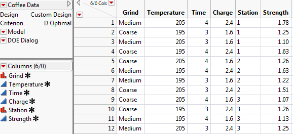 Your design and the experimental results for Strength are given in the Coffee Data.jmp sample data table (Figure 2.11), located in the Design Experiment folder.