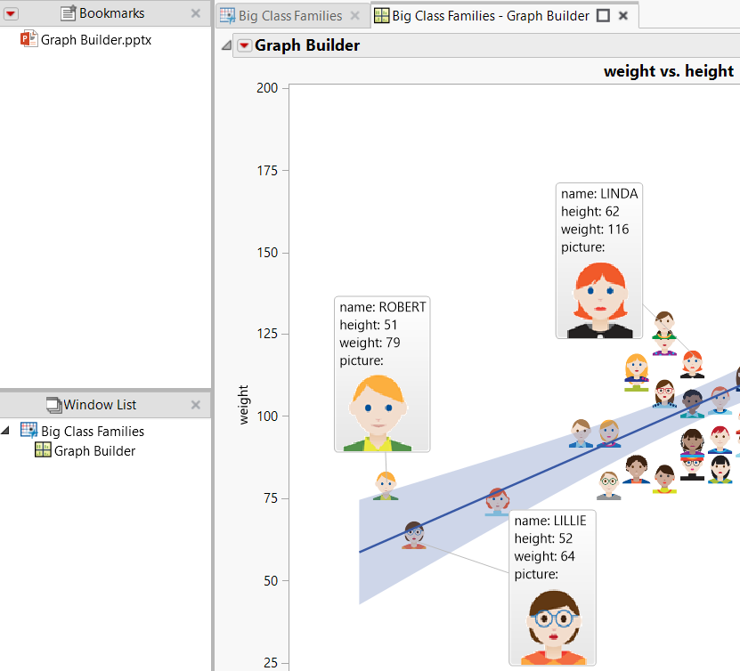 In JMP, from the Bookmarks red triangle menu, select Add Files, navigate to the Graph Builder.pptx file that you created, and then click Open (Windows) or Choose (Macintosh).