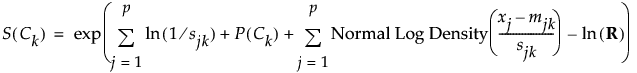 This section describes the formulas saved using the Save Probability Formula option. The conditional probability that an observation with predictor values x1, x2, …, xp belongs in the class Ck is slightly different than that given by P(Ck|(x1, ..., xp)), shown in the section Algorithm. This is done for computational efficiency.