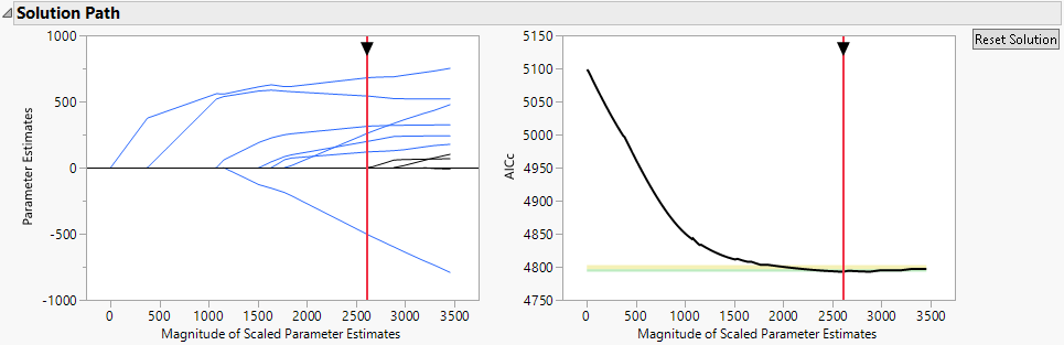 The Parameter Estimates are plotted using the vertical axis of the Solution Path Plot. These are the scaled parameter estimates. They are derived for a model expressed in terms of centered and scaled predictors (see Parameter Estimates for Centered and Scaled Predictors).