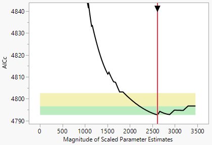 A solid vertical red line is placed in both plots at the value of the l1 norm for the solution displayed in the Parameter Estimates for Original Predictors report. You can drag the arrow at the top of the vertical red line in either plot to change the magnitude of the penalty, indicating a new current model. In the Validation Plot, you can also click anywhere in the plot to change the model. As you drag the vertical red line to indicate a new model, the results in the report update to reflect the currently selected model. A dashed vertical line remains at the best fit model. You can click the Reset Solution button next to the Validation Plot to return the vertical red line and corresponding results to the initial solution. For some validation methods, the Validation Plot provides zones that identify comparable models. See Comparable Model Zones.