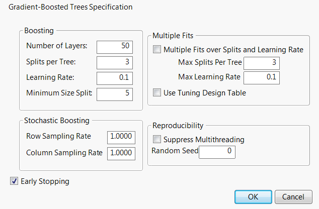 After you select OK in the launch window, the Gradient-Boosted Trees Specification window appears.