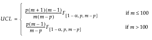 When computing Phase II control limits, new observations are independent of the historical data set. In this case, the upper control limit (UCL) is a function of the F distribution and partially depends on the number of observations in the historical data set from which the targets are calculated. The UCL is defined as follows: