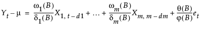 ωk(B) and δk(B) represent numerator and denominator factors (or polynomials) for individual transfer functions, with k representing an index for the 1 to m individual inputs.