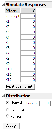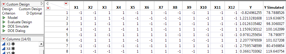 The response columns, Y and Y Simulated, are initiated with the same simulated values. The values are random values from a N(0, s) distribution. where s is the RMSE from the power analysis dialog with a default of 1. The Y Simulated values are updated with randomly generated values using the model defined by the parameter values in the Simulate Responses window. The Y column is intended for your true responses after the experiment has be run.