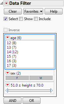 The AND button opens the Add to Selected Group list. The and operator restricts the selection. You can add variables to the filter process at any time.