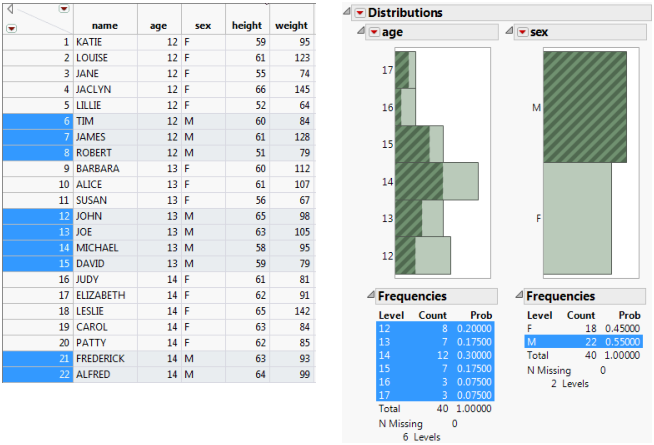Figure 8.9 Rows Containing Males Highlighted in Data Table and Histograms
