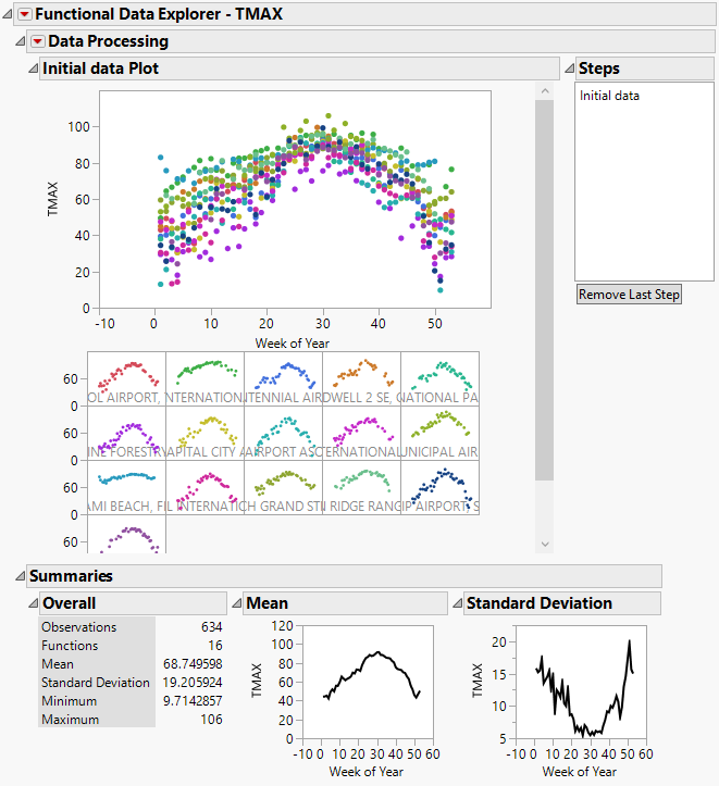 The Data Processing and Summaries reports are useful for preprocessing your data prior to fitting a model. There are data cleaning, transformation, and alignment options available in the Data Processing red triangle menu. See Data Processing Report Options. Each time you perform a preprocessing step, the graphs and summary results are automatically updated. You can perform multiple preprocessing steps in sequence. Each step is added to the list in the Steps outline of the Data Processing report. To remove the most recent step, click the Remove Last Step button below the Steps outline.