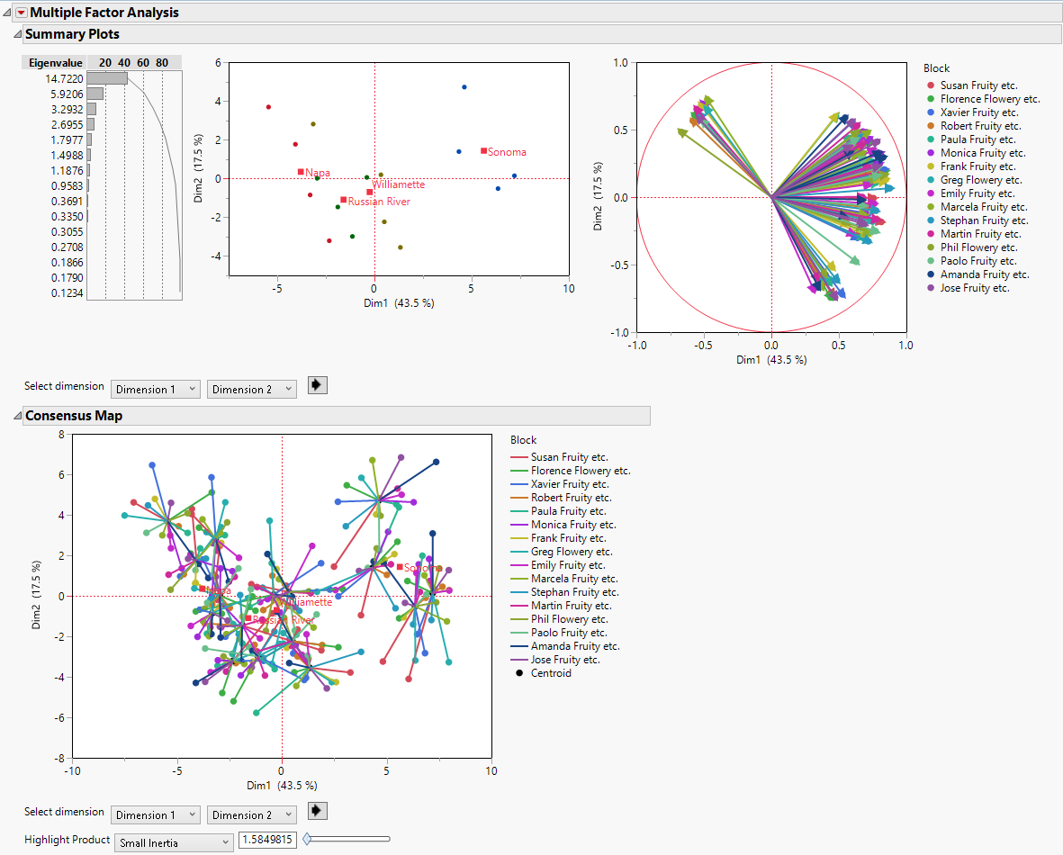 The initial Multiple Factor Analysis report shows a table of eigenvalues, summary plots, and a consensus map.
