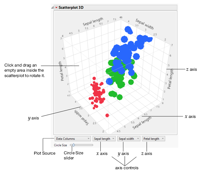 The Scatterplot 3D report shows a three-dimensional spinnable view of your data. See Figure 5.4. In the launch window, you select the variables and then create the report. The variables are displayed on the 3D scatterplots’ x, y, and z axes. Up to three variables can be displayed at a time.