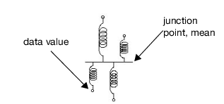 First, springs are the machine of fit for a continuous response model (Farebrother 1987). Suppose that you have n points and that you want to know the expected value (mean) of the points. Envision what happens when you lay the points out on a scale and connect them to a common junction with springs (see Figure 12.7). When you let go, the springs wiggle the junction point up and down and then bring it to rest at the mean. This is what must happen according to physics.