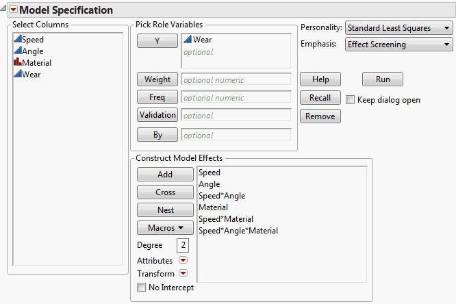 Open Tool Wear.jmp. You are interested in whether Speed, Angle, and Material, or their interactions, have an effect on the Wear of a cutting tool.