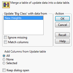 If the two tables have one or more columns whose values uniquely describe each row, JMP uses those columns as the match column values. That is, JMP updates the rows whose match column values coincide. JMP uses these columns to preserve the sorted order of the data. If your tables do not have matching column values, you can incorporate the updated values according to their row order by continuing here. To proceed with tables containing matching column values, see To update a table using matching columns.