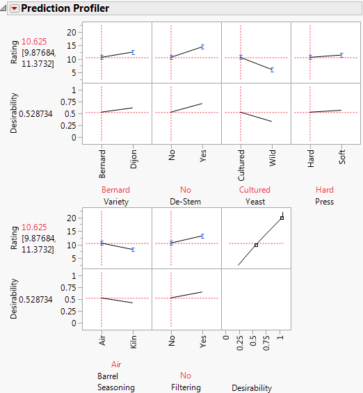 Suppose that you want the values for a factor to appear in a different order in the Prediction Profiler. Consider an example of a wine tasting experiment, constructed using Custom Design. Wine is rated by five experts, each listed as a Rater in the Wine Data.jmp sample data table. Rater is a fixed blocking factor. Nine factors are studied. Rating is the response.