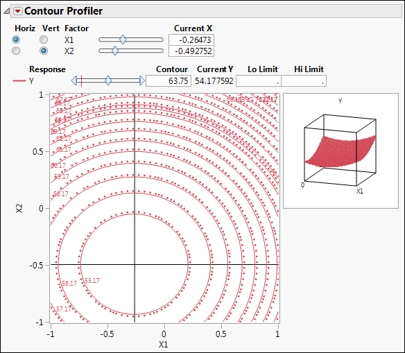 Linking the Contour Profiler to the Prediction Profiler links the Current X values in the Contour Profiler to the X values shown in the Prediction Profiler. The X values in the Prediction Profiler give the critical point where Y is minimized. The crosshairs in the Contour Profiler show the critical point. Notice that the Current Y value is 54.177592, the predicted minimum value according to the Prediction Profiler.