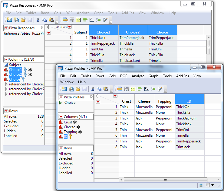 Figure 5.36 shows an example of virtually joined data tables. Pizza Profiles.jmp is the referenced data table because the ID column contains a Link ID column property. The ID column contains unique values that correspond to data in the referencing data table, Pizza Responses.jmp.