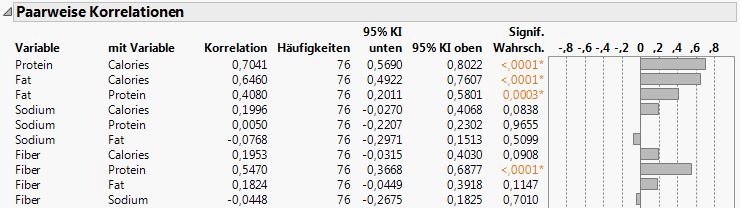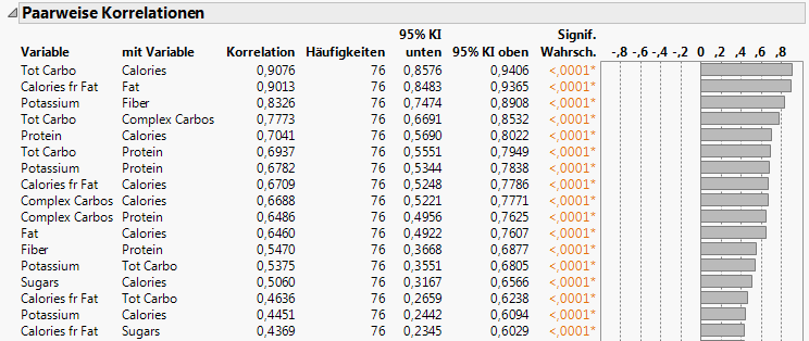 Die am höchsten korrelierten Paare werden oben im Bericht angezeigt. Die kleinen p-Werte für die Paare deuten auf Korrelation hin. Die signifikanteste Korrelation besteht zwischen Tot Carbo (Gesamtkohlenhydrate) und Calories.