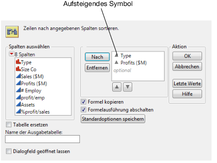 Nun ist für beide Variablen eine aufsteigende Sortierreihenfolge festgelegt. Das Symbol für die aufsteigende Sortierreihenfolge neben den Variablen ist in Symbol für aufsteigende Sortierreihenfolge zu sehen.