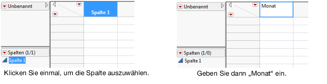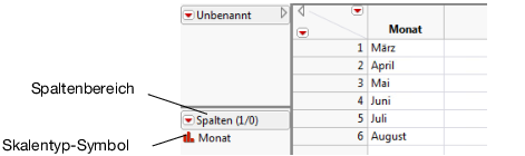 Betrachten Sie im Spaltenbereich das Skalentyp-Symbol links vom Spaltennamen. Es wurde geändert, um anzuzeigen, dass Monat nun nominal ist (zuvor war der Skalentyp stetig). Vergleichen Sie den Skalentyp für „Spalte 1“ in Eingeben eines Spaltennamens mit dem Skalentyp für „Monat“ in Erstellte Spalte Monat. Dieser Unterschied ist wichtig und wird in Spalteninformationen anzeigen oder ändern erläutert.