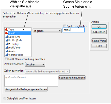 Wählen Sie Zeilen > Zeilenauswahl > Auswahl nach Bedingung, um das Fenster Zeilen auswählen zu öffnen.