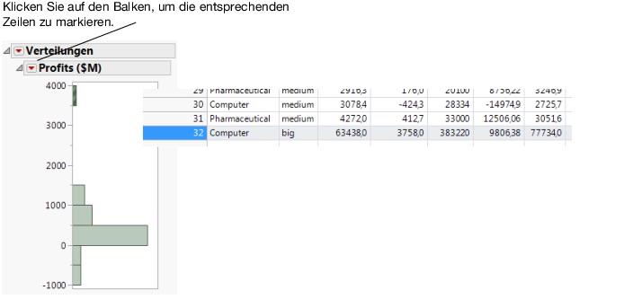 Plattformergebnisse sind mit der Datentabelle verknüpft. Das Histogramm in Verbindung zwischen Plattformergebnissen und Datentabelle zeigt, dass eine Gruppe von Unternehmen einen wesenlich höheren Gewinn macht als die anderen. Um diese Gruppe schnell zu identifizieren, klicken Sie auf ihren Histogrammbalken. Die entsprechenden Zeilen in der Datentabelle werden markiert.