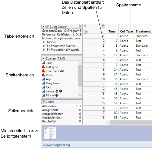 Im Datenblatt sind die Daten in Zeilen und Spalten angeordnet. Im Allgemeinen entspricht jede Zeile im Datenblatt einer Beobachtung und die Spalten (so genannte Variablen) liefern Informationen über die Beobachtungen. In Eine Datentabelle entspricht jede Zeile einer Testperson und es sind zwölf Spalten mit Informationen vorhanden. Wenngleich nicht alle zwölf Spalten im Datenblatt angezeigt werden können, sind sie im Bereich „Spalten“ zu sehen. Die Informationen über jede Testperson umfassen die Uhrzeit, den Zelltyp, die Behandlung und anderes. Jede Spalte hat eine Überschrift bzw. einen Namen. Dieser Name ist nicht Teil der Gesamtzahl der Tabellenzeilen.