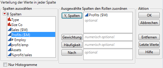 Die Variable Profits ($M) wird in der Rolle Y, Spalten angezeigt. Das ausgefüllte Fenster ist in Profits ($M) zuweisen zu sehen.