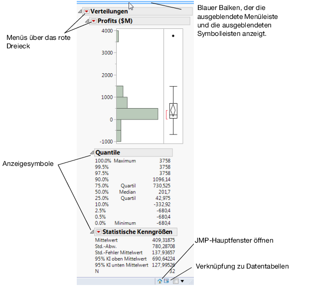 Unter Windows klicken Sie auf die Schaltfläche JMP-Hauptfenster in der Ecke unten rechts, um das Hauptfenster anzuzeigen. Unter Macintosh wählen Sie Fenster > JMP-Hauptfenster.