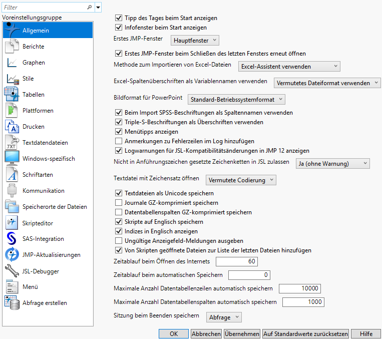 Sie können die Einstellungen in JMP im Fenster „Voreinstellungen“ ändern. Um das Fenster „Voreinstellungen“ aufzurufen, wählen Sie Datei > Voreinstellungen (Windows) oder JMP > Voreinstellungen (Macintosh).