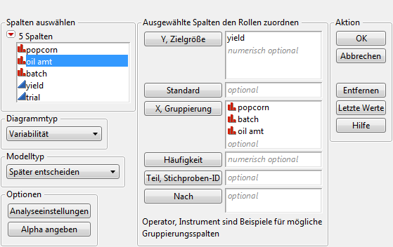 In diesem Beispiel wird die Datentabelle Popcorn.jmp mit Daten eines Popcornherstellers verwendet. Der Ertrag (das Volumen an Popcorn aus einer bestimmten Anzahl von Maiskörnern) wurde für jede Kombination von Popcorntypen, Verarbeitungsgrößen und benutzter Ölmenge gemessen.