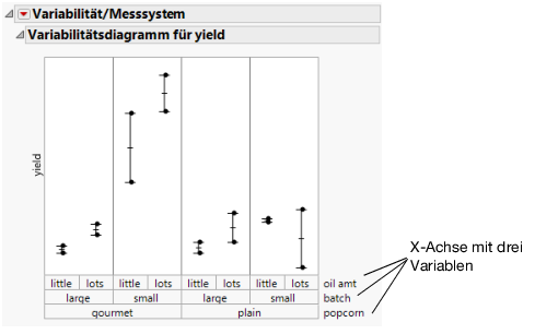 Hinweis: Die Reihenfolge, in der Sie die Variablen der X, Gruppierung-Rolle zuweisen, ist wichtig, weil die Reihenfolge in diesem Fenster ihre Verschachtelungsreihenfolge im Variabilitätsdiagramm bestimmt.