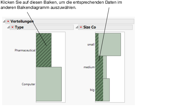 Nehmen Sie beispielsweise an, dass Sie die Verteilung der Unternehmensgröße für die Pharmaunternehmen ansehen möchten. Klicken Sie auf den Balken „Pharmaceutical“ im Balkendiagramm Type, und die Pharmaunternehmen werden im Balkendiagramm Size Co markiert. Klicken auf Balken zeigt: Die meisten Unternehmen in dieser Datentabelle sind zwar klein, die meisten Pharmaunternehmen hingegen mittelgroß bis groß.