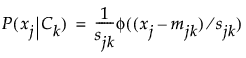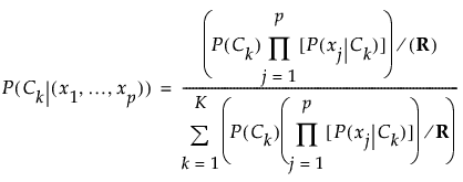 where R is a regularization constant. In the formula above, the conditional probability that an observation with Xj = xj belongs to the class Ck, P(xj|Ck), is given as follows: