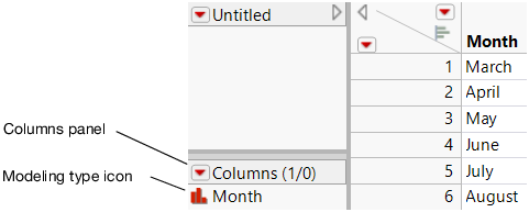 In the columns panel, look at the modeling type icon to the left of the column name. It has changed to reflect that Month is now nominal (previously it was continuous). Compare the modeling type shown for Column 1 in Figure 3.3 and for Month in Figure 3.4. This difference is important and is discussed in View or Change Column Information.