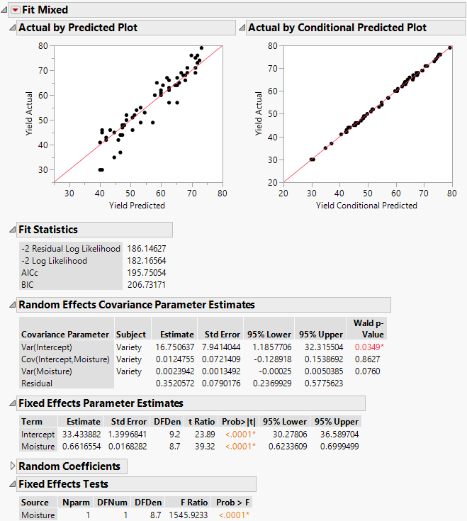 The Random Effects Covariance Parameter Estimates report gives estimates of the variance of the varieties’ intercepts, Var(Intercept), and slopes, Var(Moisture), and their covariance, Cov(Moisture, Intercept). In this case, the intercept and slope are not significantly correlated, because the confidence interval for the estimate includes zero. The report also gives an estimate of the residual variance.