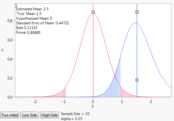 By default, the animation shows a two sided test. Use the Two Sided, Low Side, and High Side buttons to toggle between not equal, less than, or greater than alternative hypotheses.