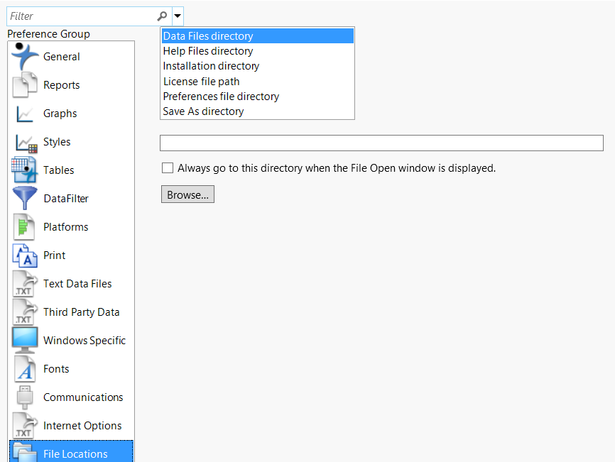 Preferences file directory | Change the folder in which JMP looks for preference information. |