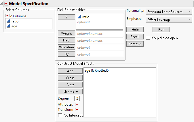 Use the Knotted Spline Effect option to fit a segmentation of smooth polynomials to a specified effect. When you select this attribute, a window appears, enabling you to specify the number of knot points. (Knotted splines are implemented only for main-effect continuous terms.)